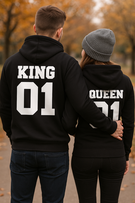 👑❤️ Karaļa un Karalienes statusu tagad var atpazīt — pēc muguras! Divi melni džemperi ar kapuci ar uzrakstiem KING 01 un QUEEN 01 jūsu saskaņotību paceļ līdz karaliskam līmenim.