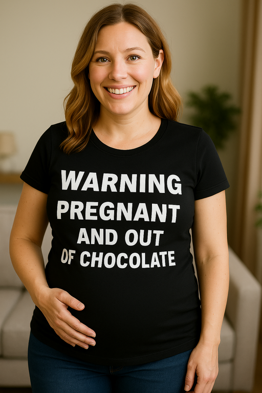 🚨 Šokolādes trauksme! Šis grūtnieču T-krekls ar uzrakstu WARNING PREGNANT AND OUT OF CHOCOLATE pasaka visu, vēl pirms tu paspēji ko teikt. Kad uznāk kāre, tas ir tavs oficiālais signāls tūlītējai kakao piegādei.