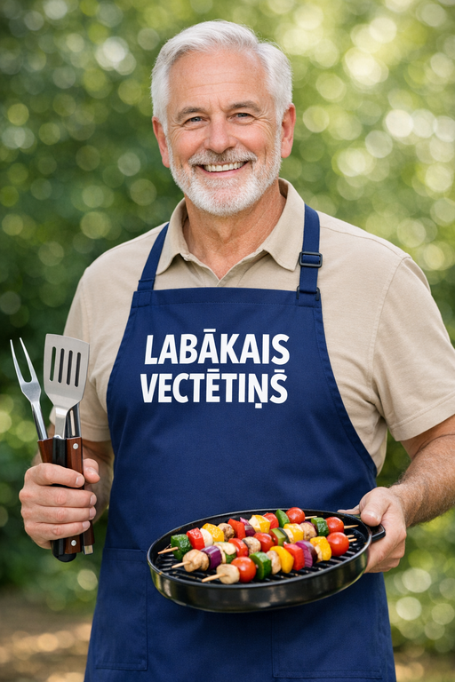 Tumši zilais priekšauts ar skaidru uzrakstu LABĀKAIS VECTĒTIŅŠ uzreiz piešķir noskaņu un pasaka, kurš ir galvenais pie pannas un grila. Praktiska krāsa palīdz noslēpt sīkus “varoņdarbu” traipus, bet komplimenti un smaidi nāk komplektā.