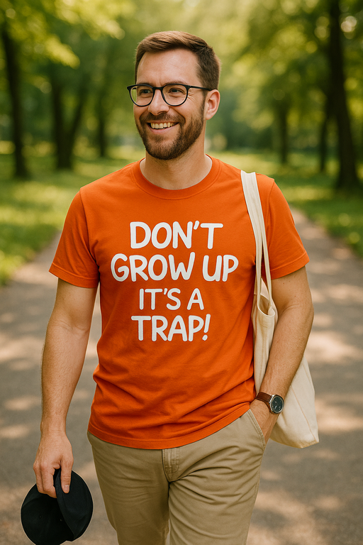 🙃 ‘DON’T GROW UP IT’S A TRAP!’ – oranžs T-krekls, kas pieaugušo dzīvei atstāj "seen". Šis koši oranžais T-krekls ar īsām piedurknēm ir tavs oficiālais attaisnojums visām bērnišķībām. Velc to ballītē, birojā vai uz dīvāna un eleganti paskaidro, kāpēc rēķini un nopietnas sejas ir pēdējā izvēle. Ar šo kreklu smiekli atnāk ātrāk nekā atbildības!