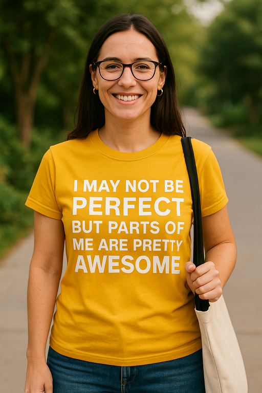 😜 Perfektumu mēs nepiegādājam, bet ‘awesome’ mums netrūkst — un šis sinepju dzeltenais T-krekls to skaļi pasaka: I MAY NOT BE PERFECT BUT PARTS OF ME ARE PRETTY AWESOME.