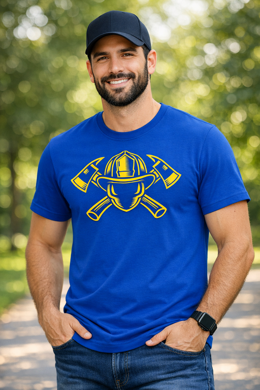 Kad ķivere un sakrustotie cirvji runā skaļāk par vārdiem — karaliski zilais fons ar koši dzeltenu grafiku izceļas uzreiz. Ugunsdzēsēju depo, mācībās vai komandas pasēdēšanā visiem būs skaidrs: te nāk drosme un labs humors vienā komplektā.