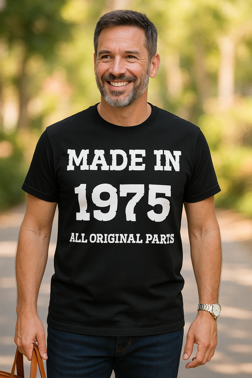 🛠️ Oriģinālas detaļas, 100% harizma! Melns T‑krekls ar uzrakstu MADE IN 1975 ALL ORIGINAL PARTS pasaka visu tavā vietā. Paredzēts visiem, kas “ražoti” 1975. gadā un joprojām darbojas bez atjauninājumiem. Īsās piedurknes nodrošina vieglu noskaņu, bet melnā krāsa izceļ leģendāro uzrakstu. Uzjautrini jebkuru ballīti un uzdāvini veselīgu nostalgijas devu.