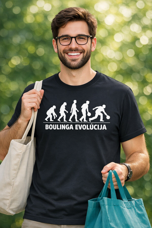 BOULINGA EVOLŪCIJA ir perfekts joks boulinga faniem: melns krekls ar košu baltu apdruku, kas pasaka visu tavā vietā – tu neesi te atnācis vienkārši “pamētāt bumbu”.