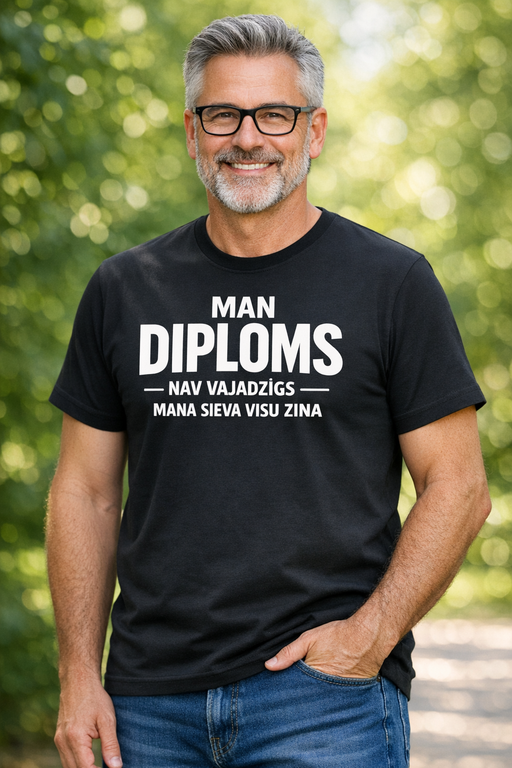 MAN DIPLOMS NAV VAJADZĪGS — MANA SIEVA VISU ZINA ir perfekts joks vīram vai draugam, kurš bez strīdiem atzīst realitāti. Melns krekls ar baltu apdruku izskatās stilīgi un uzreiz paceļ garastāvokli.