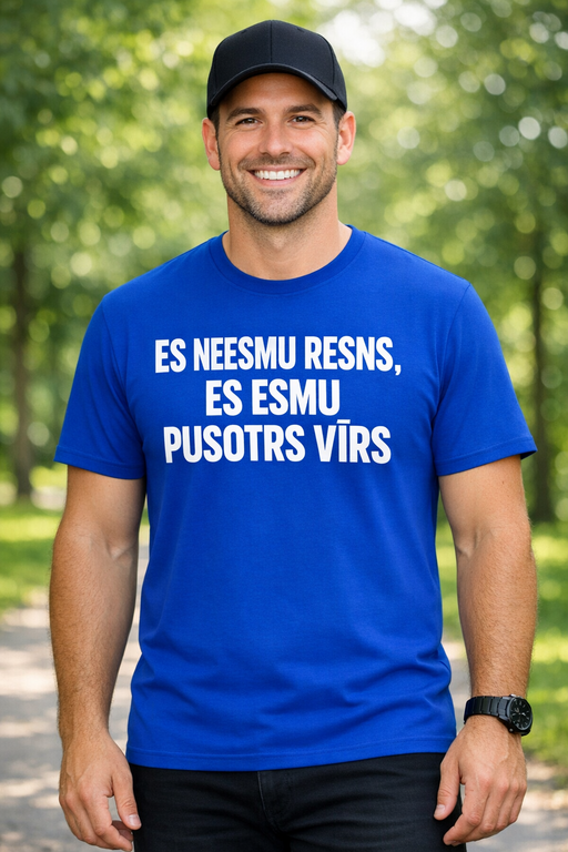 Neesmu resns, esmu pusotrs vīrs – īsts pašironijas hīts, kas uzreiz paceļ garastāvokli un liek pasmaidīt apkārtējiem. Uzvelc un parādi, ka tev ir harizma (un vēl mazliet vairāk).