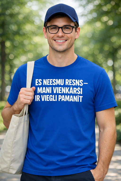 Karaliski zilais fons un koši baltais uzraksts ES NEESMU RESNS — MANI VIENKĀRŠI IR VIEGLI PAMANĪT strādā kā magnēts: viens skatiens, un smaids ir klāt.