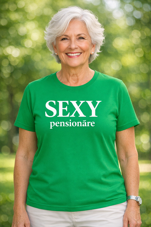 Košs zaļš T-krekls ar pārliecinošu uzrakstu SEXY pensionāre – viegli uzvelc un uzreiz ir skaidrs, kurš te ir ar harismu un humora izjūtu.