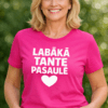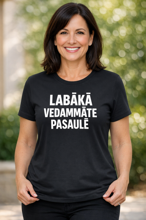 Melns, pieguļošs T-krekls ar kontrastējošu baltu uzrakstu LABĀKĀ VEDAMMĀTE PASAULĒ uzreiz izsauc smaidu un palīdz uzturēt mieru pie svētdienas galda — īsta ģimenes diplomātija znotiem un vedeklām.