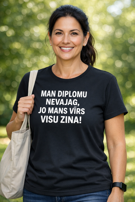 “MAN DIPLOMU NEVAJAG, JO MANS VĪRS VISU ZINA!” — ja tev patīk sarkasms un mīļš zobgalīgums, šis krekls vienā teikumā pasaka visu un garantē smaidu.