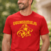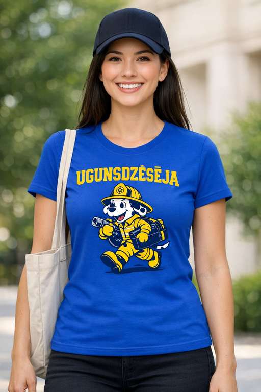 Zilais krekls ar dzeltenu grafiku un uzrakstu UGUNSDZĒSĒJA ir pamanāms, pašpārliecināts un radīts darbībai — no mācībām līdz pasākumiem un ikdienas skrējienam pēc kafijas, kad izsaukums jau norimis.