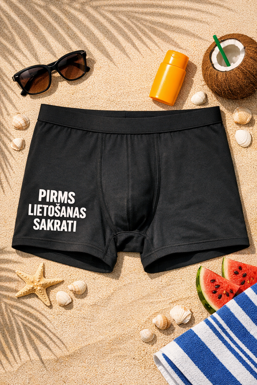 Kad temperatūra ceļas, uzraksts pasaka visu priekšā: PIRM LIETOŠANAS SAKRATI. Melni bokseršorti ar drosmīgu, bet gaumīgu apdruku – smiekli un pārliecība komplektā.